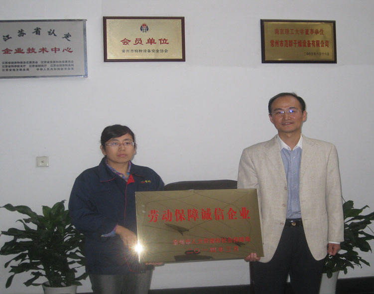 根据省人社厅《江苏省企业劳动保障诚信等级评价试行办法》和《常州市劳动保障诚信企业评价管理试行办法》的规定,由区社会保障行政部门劳动监察机构培育与推荐, 经市社会保障行政部门综合考评,我公司被评为2014年市级劳动保障诚信企业,日前已经从区劳动保障部门领到铜牌。