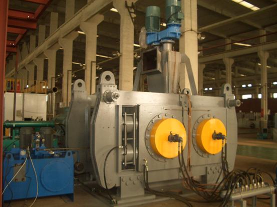 该对辊式压片造粒机由机架组件,压辊组件,传动装置,液压缓冲组件及喂料机五部分组成.其工作原理为: 该机利用成对压辊,彼此留有一定间隙,采用同步控制器控制两台电机和减速机,使对辊同步且相向运转。其中一组对辊轴座固定,另一组对辊轴座滑动,藉助液压缸施压彼此紧靠,同时液压系统还起补偿作用。压辊表面有规则地排列许多形状、大小相同的穴孔(弧槽),根据物料对象压缩比的不同,选择采用一压辊穴孔的波谷正好对准另一压辊的波谷或波峰对准波谷。两压辊呈水平布置,粉粒状物料从两压辊上方连续、均匀地靠自重及挤压绞龙强制喂入两压辊之间,当物料进入咬入区后逐渐被压辊咬入,随着压辊的连续旋转,物料占有的空间逐渐减少而被逐步压缩,并达到成型压力的最大值,随后,则压力逐渐降低,所压得之压片,因弹性回复加其压片自重而脱落压辊弧槽,接下来进入切碎、整粒装置并筛分至粒状产品。