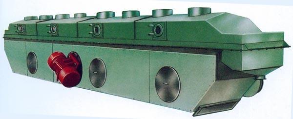 物料自进料口进入机内,在振动力作用下,物料沿水平方向抛掷向前连续运动,热风向上穿过流化床同湿物料换热后,湿空气经旋风分离器除尘后由排风口排出;干燥物料由排料口排出。
