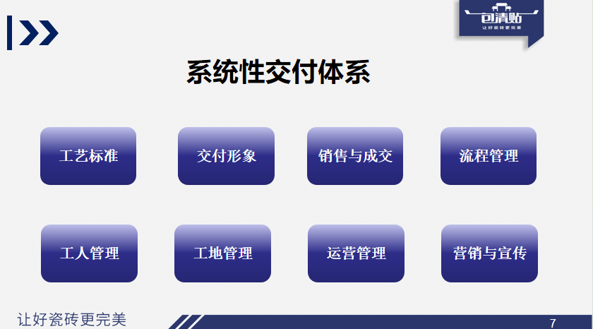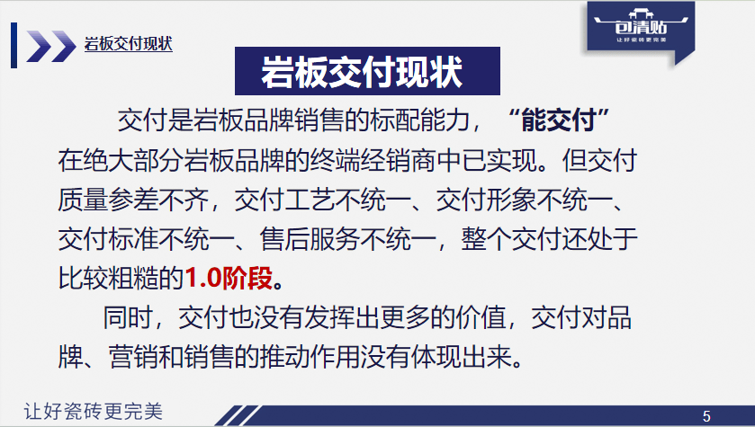 从行业端来看,首先是标准混乱,交付工艺不统一▲…,薄贴、半干砂浆等工艺混用,交付形象、服务标准也参差不齐◆;其次是落地不足,很多企业虽然喊着交付升级的口号▪◇▼,但真正把交付体系往终端落实的很少,只有少数落地企业尝到了甜头☆…。比如马可、诺贝尔、东鹏、蒙娜丽莎、简一等大品牌的交付体系都是我们搭建的★,他们真正地把交付当成一件重要的事情去干…,那些落地的企业都已经尝到了甜头○。平台型企业最大的变化是什么?逐渐意识到单纯卖产品不赚钱=-▲,开始向“包安装▷”转型,但二三线品牌仍以卖产品为主,交付端缺乏突破。