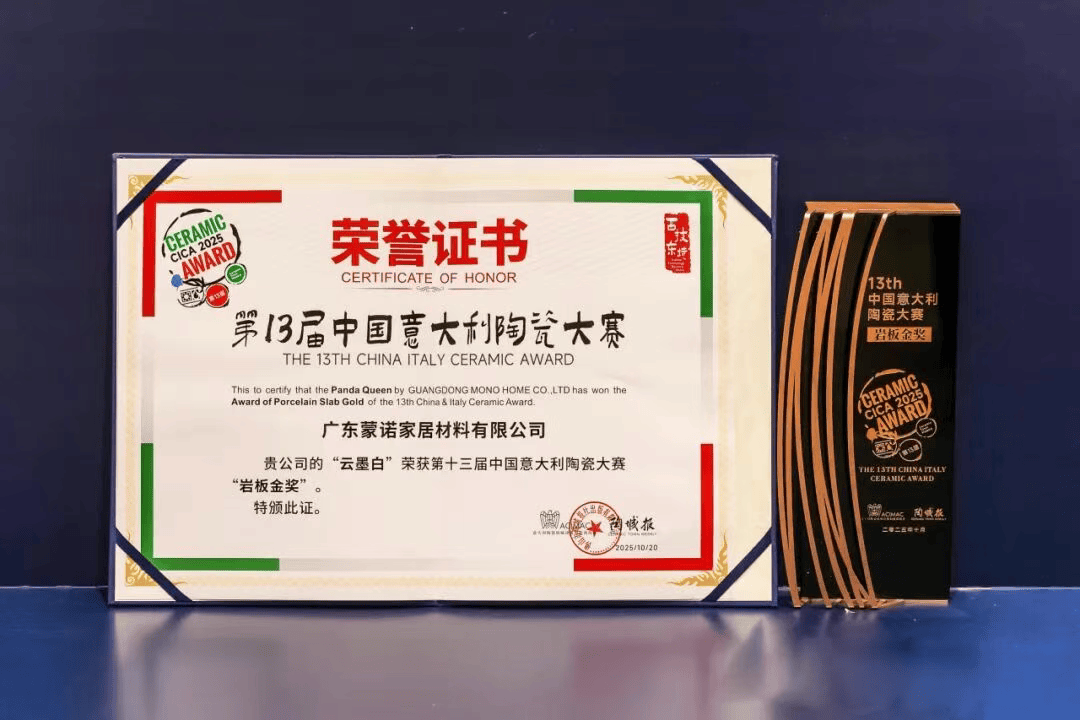 2025年12月29日早上,在佛山希尔顿酒店举办的2025全球陶瓷新生态年度论坛暨第十届金砖奖颁奖盛典上,蒙诺石材岩板「云墨白」质感通体岩板凭借卓越美学设计与突破性技术实力,