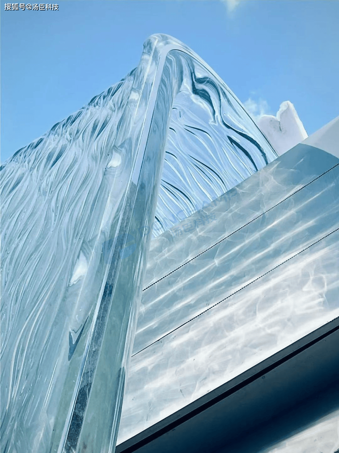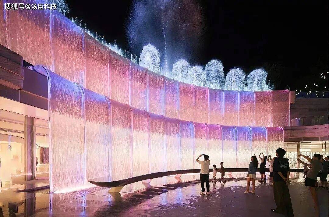 28块“7字形▲-”亚克力单元板构成的水景系统,横贯地上和地面下沉空间,水流沿表面精雕波浪花纹潺潺而下,与灯光交织成梦幻帷幕。