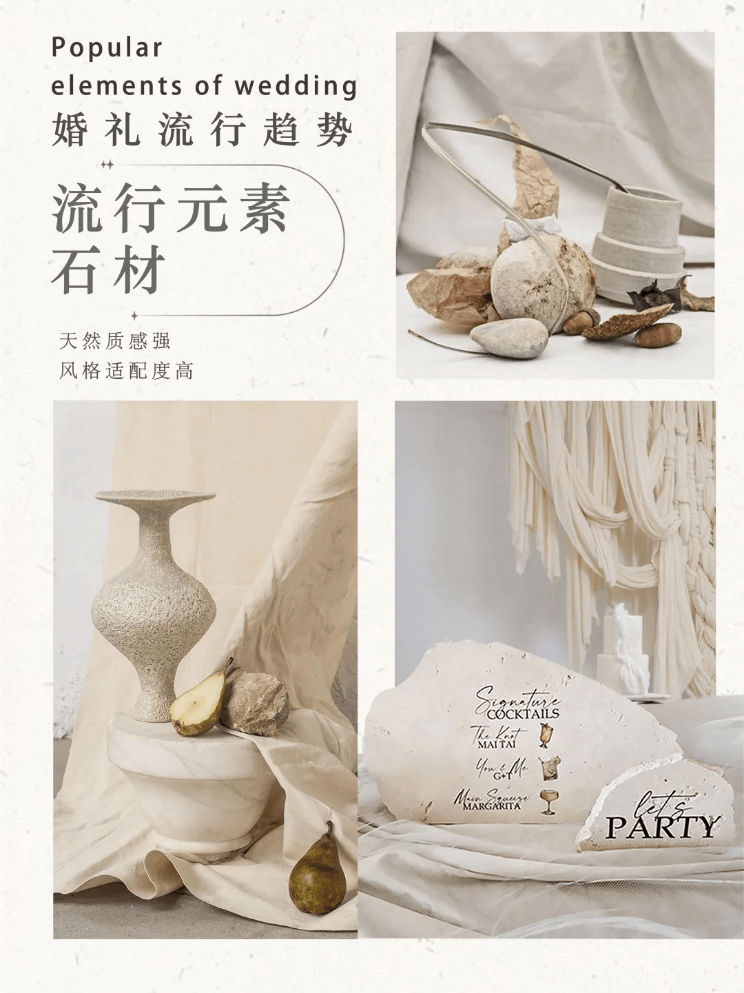 带点粗犷感的岩石,不管是大块的作为背景点缀●★,还是小块的当桌花底座,都能带来一种贴近自然的原始气息=○。搭配绿植或鲜花,能让婚礼多一份沉稳的质感☆-○,适合户外或自然风婚礼=。