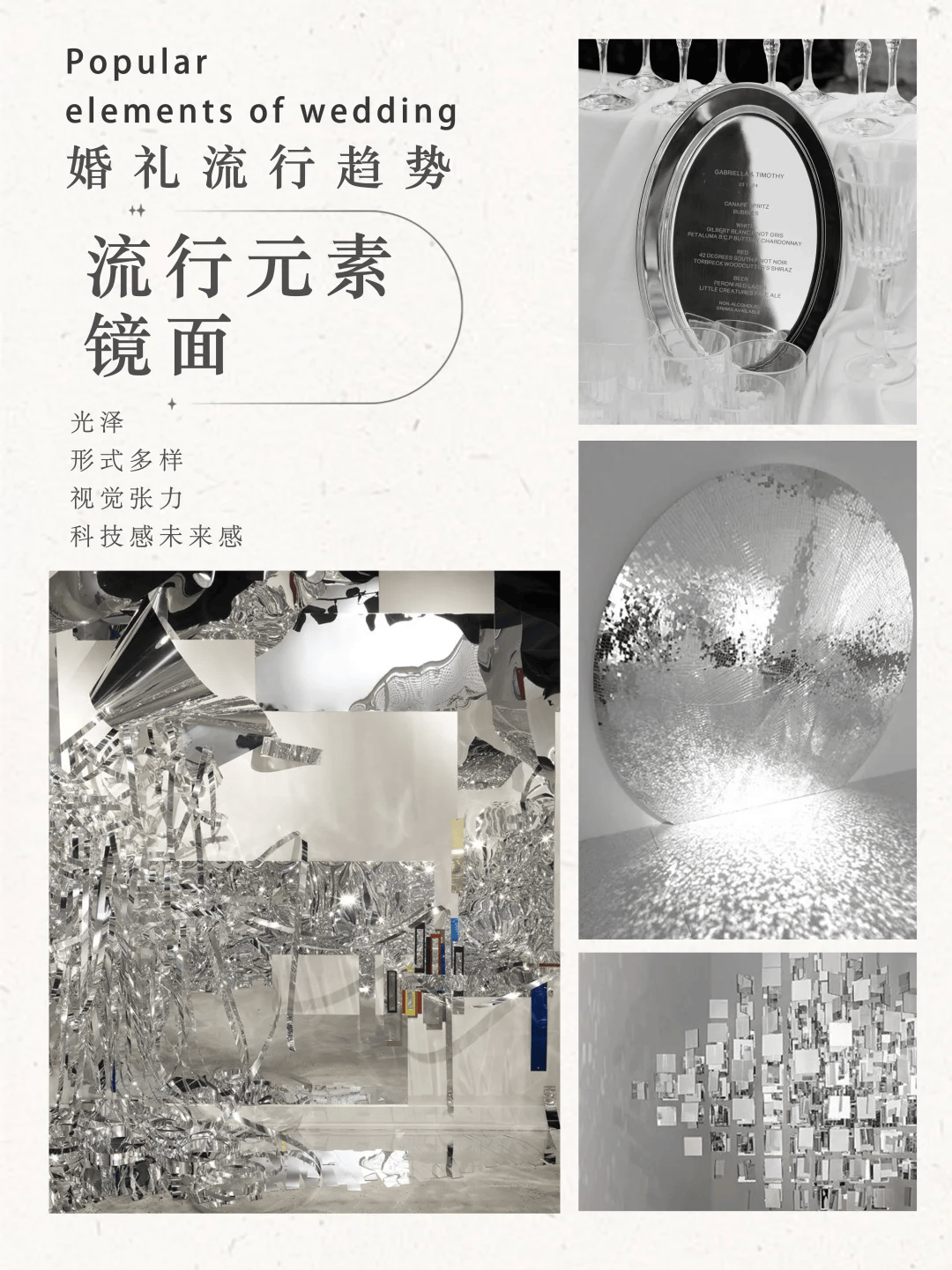 镜面装饰自带未来感,不仅能反射光线让场地更明亮,还能在视觉上扩大空间感,特别适合现代风或极简风格的婚礼○☆。