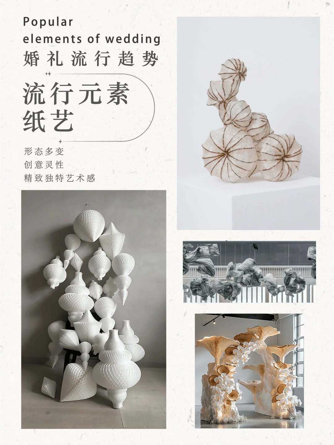 褶皱纸花、立体纸雕……纸艺的独特纹理和自然形态,能为婚礼增添一份手作的温度,适合喜欢小众文艺风格的新人。