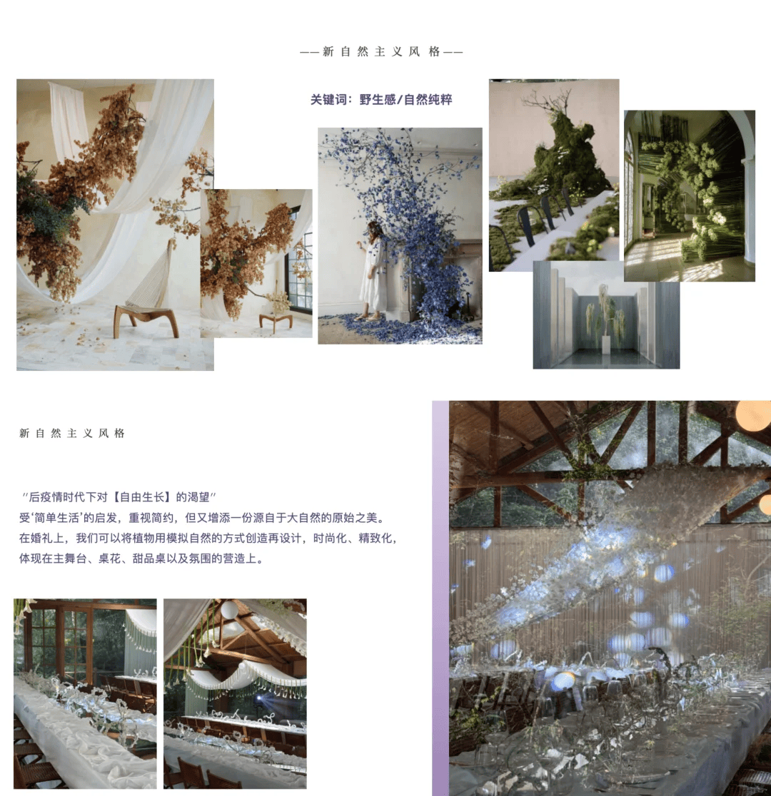 后疫情时代下对【自由生长】的渴望,受简单生活的启发★▷,重视简约,但又增添一份源自于大自然的原始之美•☆。在婚礼上,我们可以将植物用模拟自然的方式创造再设计,时尚化、精致化▪■=,体现在主舞台☆、桌花■●◁、甜品桌以及氛围的营造上。