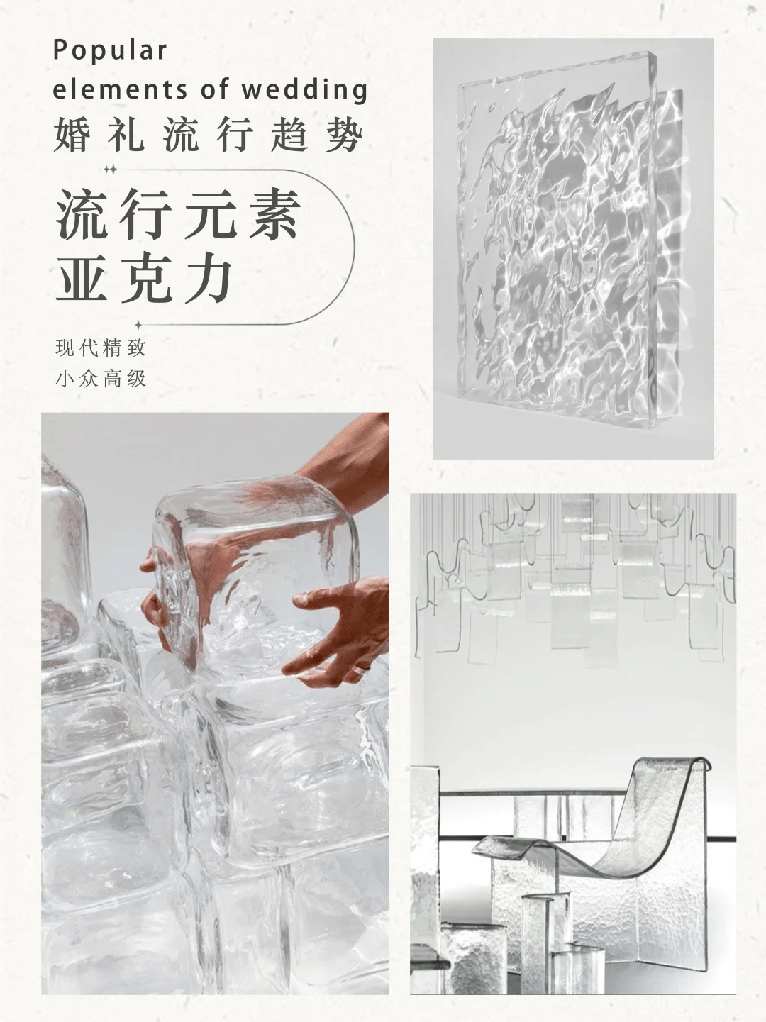 亚克力材质通透轻便◁,颜色也多样○,做成桌牌■▽▷、路引或者背景装饰都很合适。它不厚重,还能透出光线,让婚礼现场显得干净又现代,很适合喜欢简约清爽风格的新人。