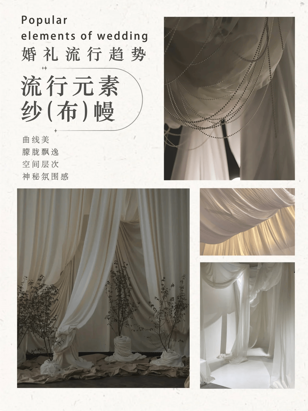柔软的布幔垂坠而下,搭配灯光或自然光影,轻松营造出温柔浪漫的氛围。无论是作为背景还是顶饰,都能让婚礼现场更有沉浸感。
