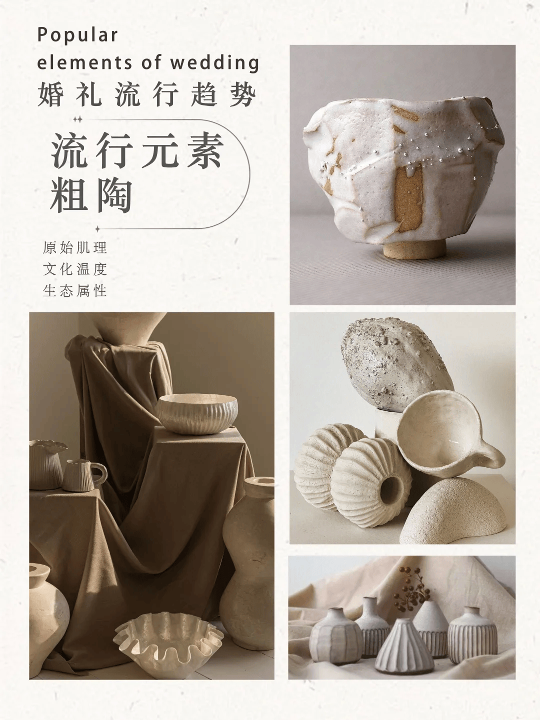 粗陶的天然肌理和手工感○▪△,能为婚礼带来一份返璞归真的气息,适合自然系或侘寂风婚礼,让现场更有故事感。