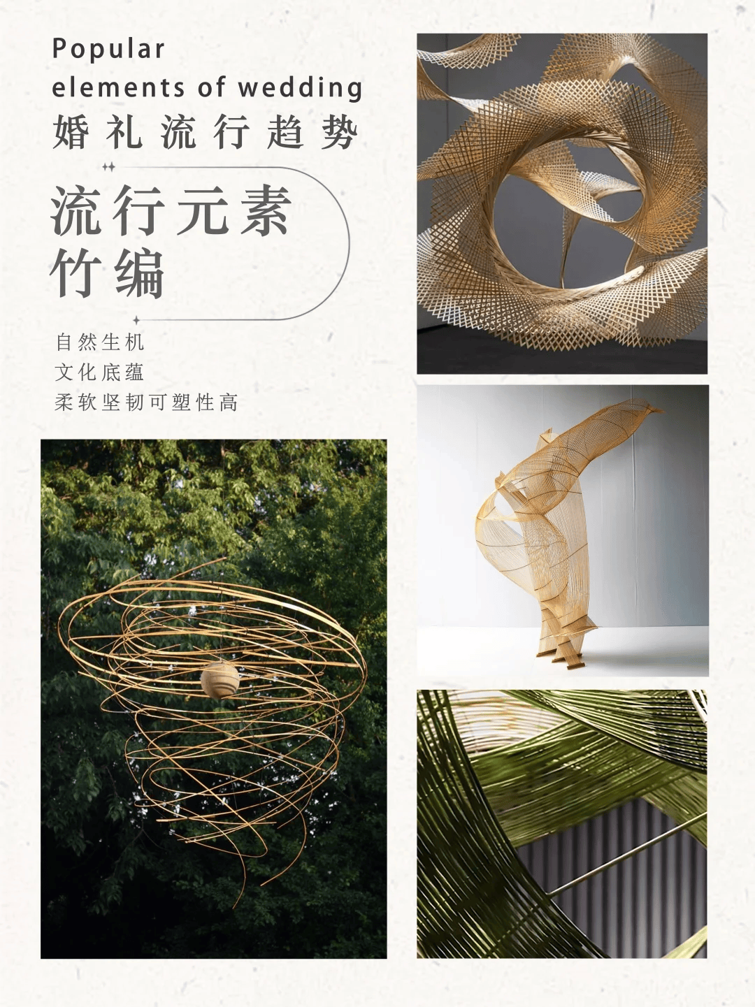 竹编的天然纹理和流畅线条,能为婚礼增添一份质朴的高级感○•◇。无论是作为花器、背景装饰,还是仪式道具,都能让婚礼更显独特气质。
