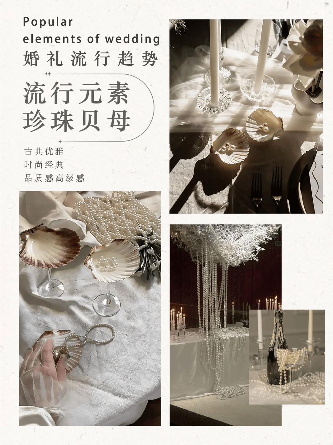 珍珠贝母的温润光泽,无论是用在婚纱、饰品还是桌面装饰上,都能提升整体质感◇,让婚礼显得精致又高级。
