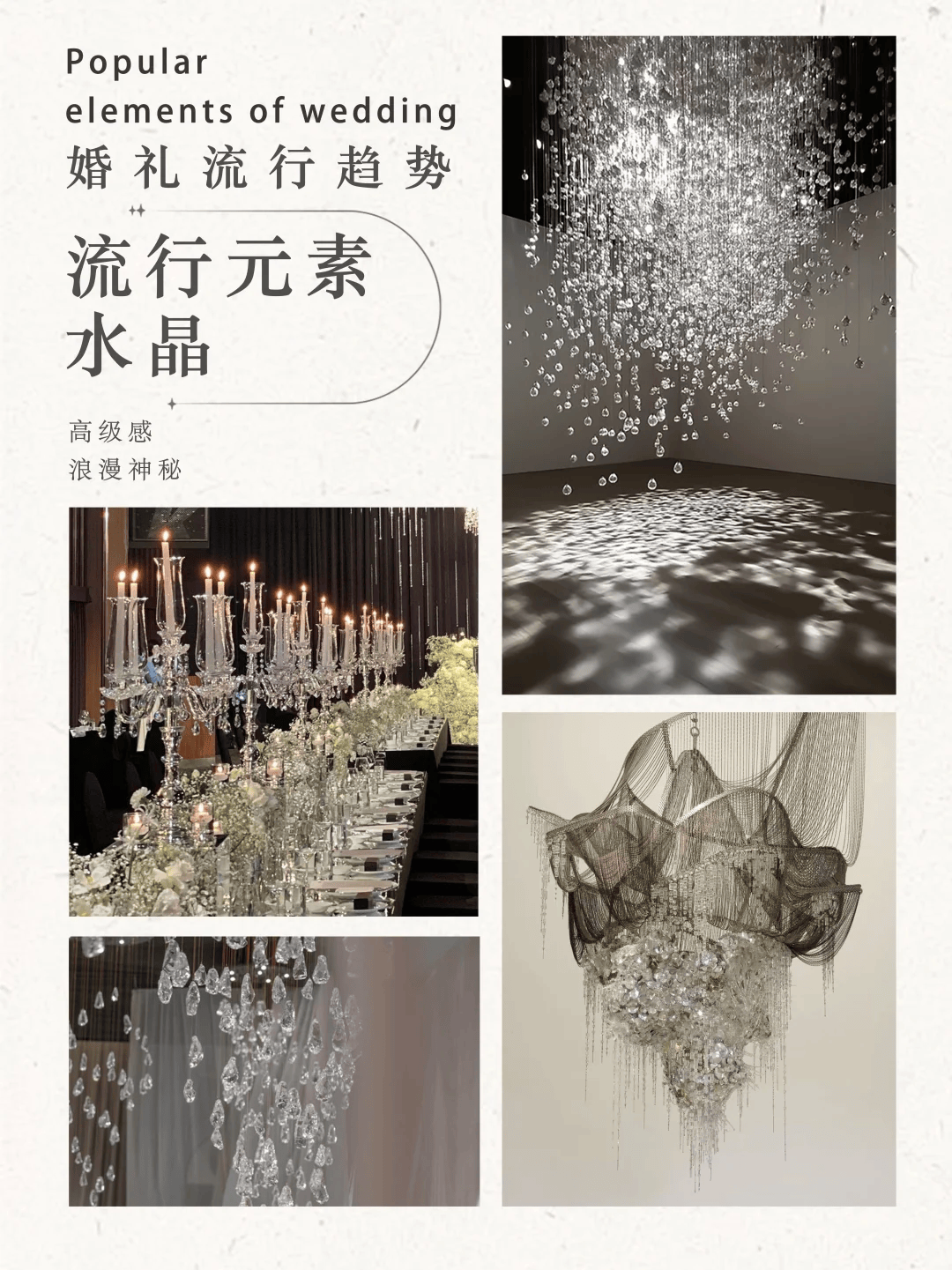 水晶的剔透质感•■,在灯光下折射出绚丽光芒,能为婚礼增添华丽氛围,适合喜欢轻奢或复古风格的新人。