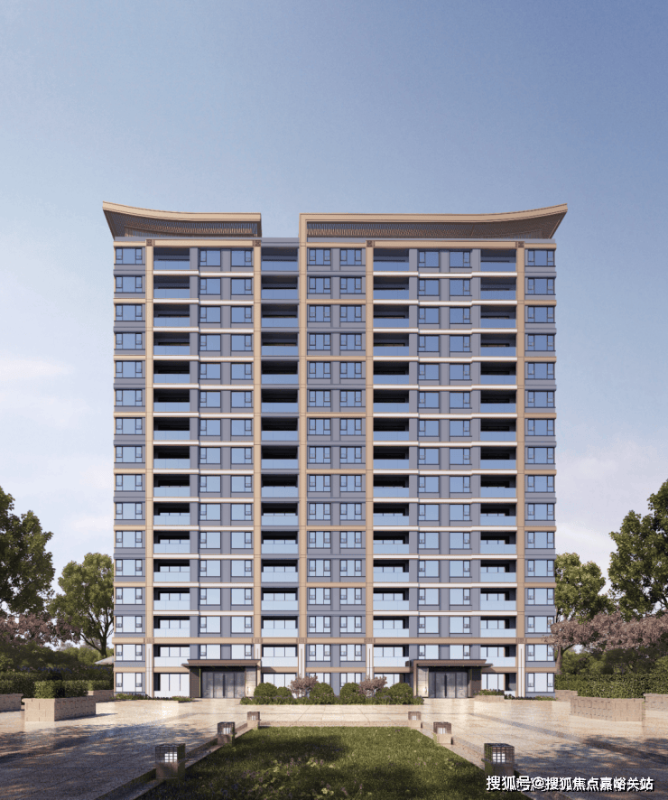 项目建筑外立面主色调为香槟金色与灰色相结合,单元入口部位使用蓝眼睛石材及香槟金色金属◇-;更独特的是,项目将东方飞檐元素融入现代美学立面