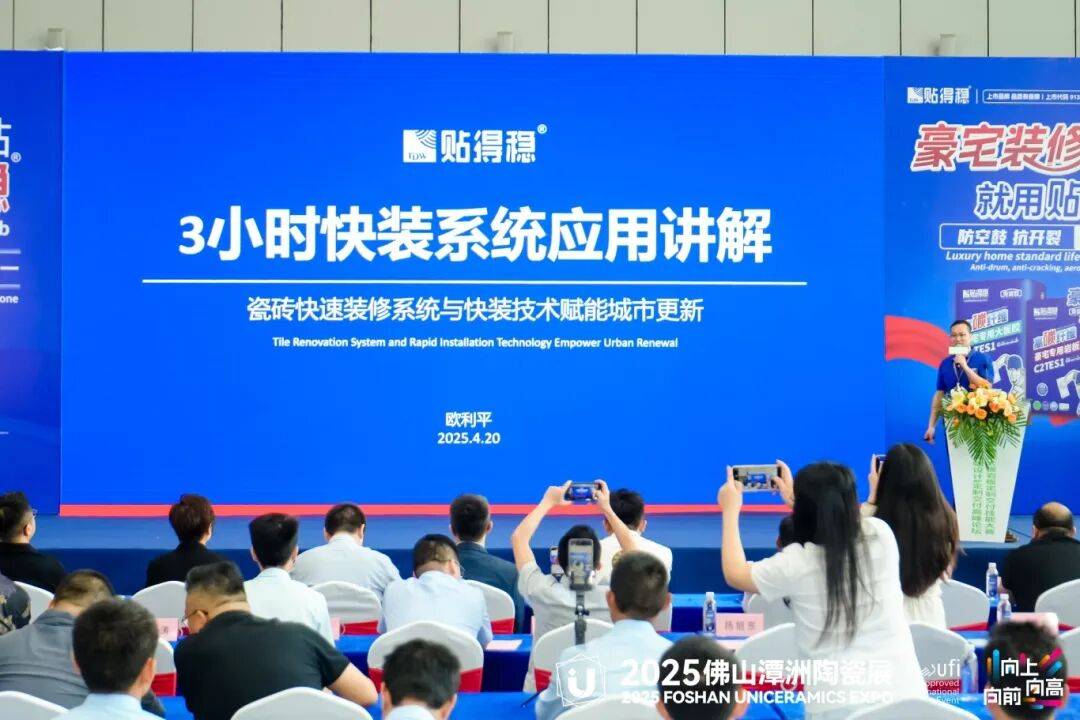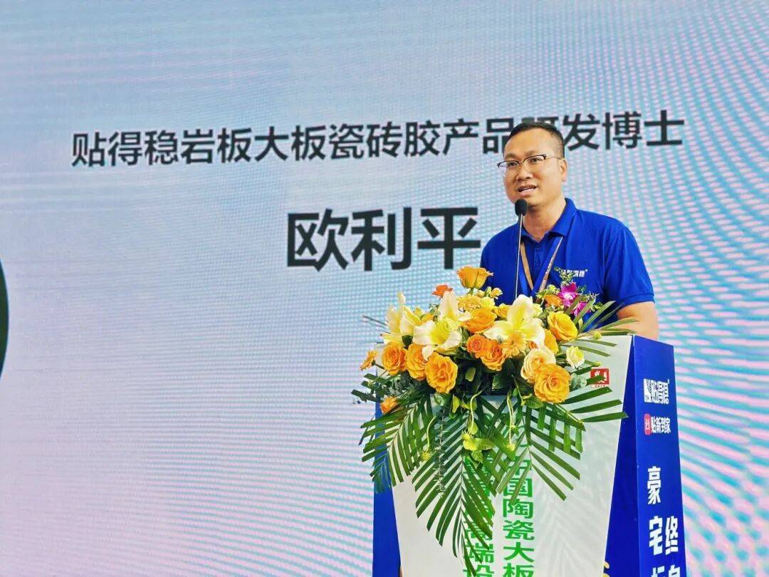 紧接着,贴得稳岩板大板瓷砖胶产品研发博士欧利平先生进行了“3小时快装系统应用讲解=”的主题演讲。欧博士详细介绍了这一革命性技术,探讨了如何在施工中提升效率的同时保持高质量标准。这项技术的成功应用,不仅提升了施工效率,也推动了整个行业向标准化与高效化迈进。