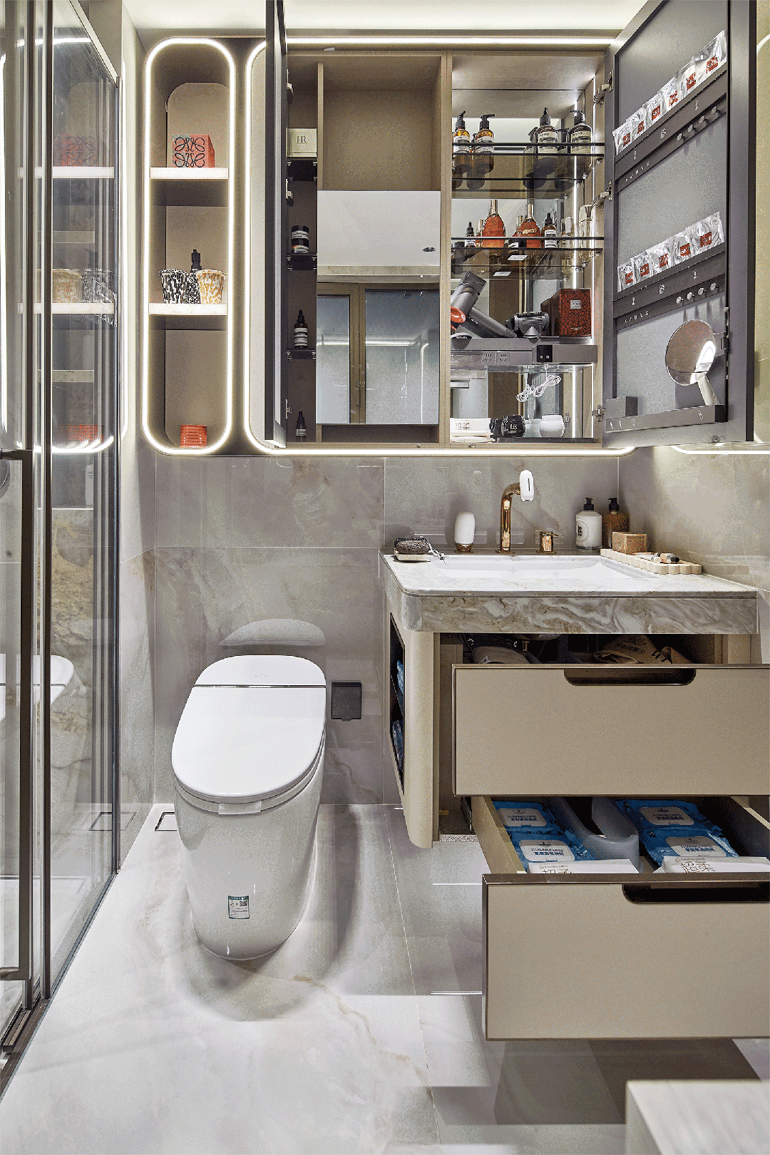 保利天奕特别关注到女性的生活需求,专门在卫生间配备了美妆龙头▪□■、美妆镜柜、美妆冰箱,采用“顶+面双补光照明”,能把“女本位”需求做到如此细致,目前没有几个项目能做到!