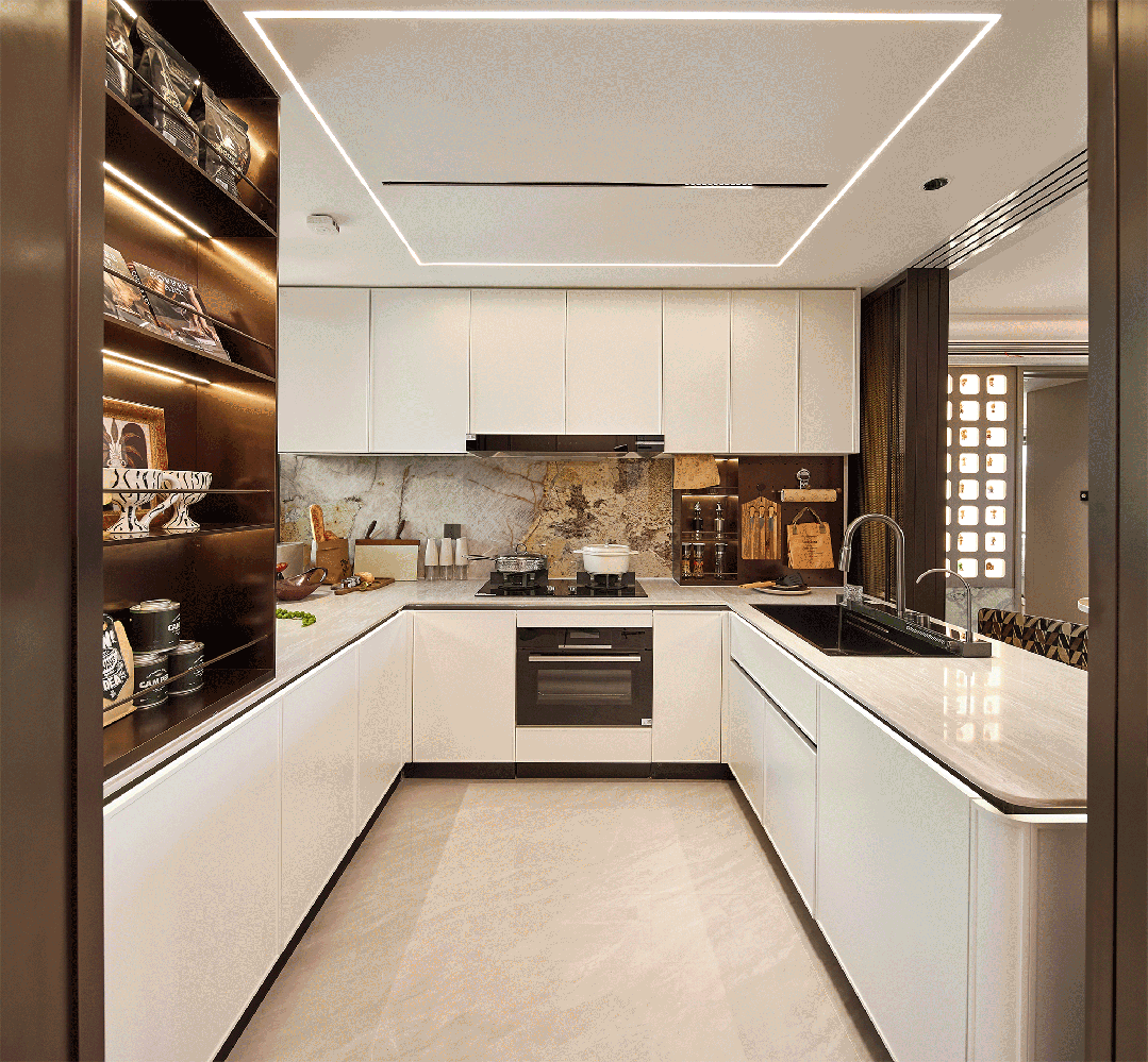 譬如说部分柜体更安全的圆角处理、高柜顶部一窥到底的镜面反光膜-、大大提高空间利用的薄抽,不用弯腰一踢即开的踢脚抽设计,便利性大大增加;