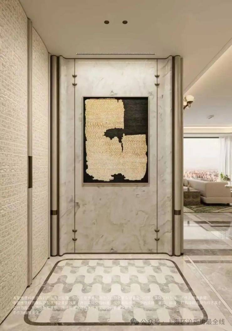 约2㎡玄关拼花采用胜利拱券 × 全水刀工艺○!超高压切割让石材切口平整无崩边…□,结构更稳定,搭配天然石材的高硬度属性▲=▽,长久使用依旧光洁如新-◁,省去后期维护烦恼。