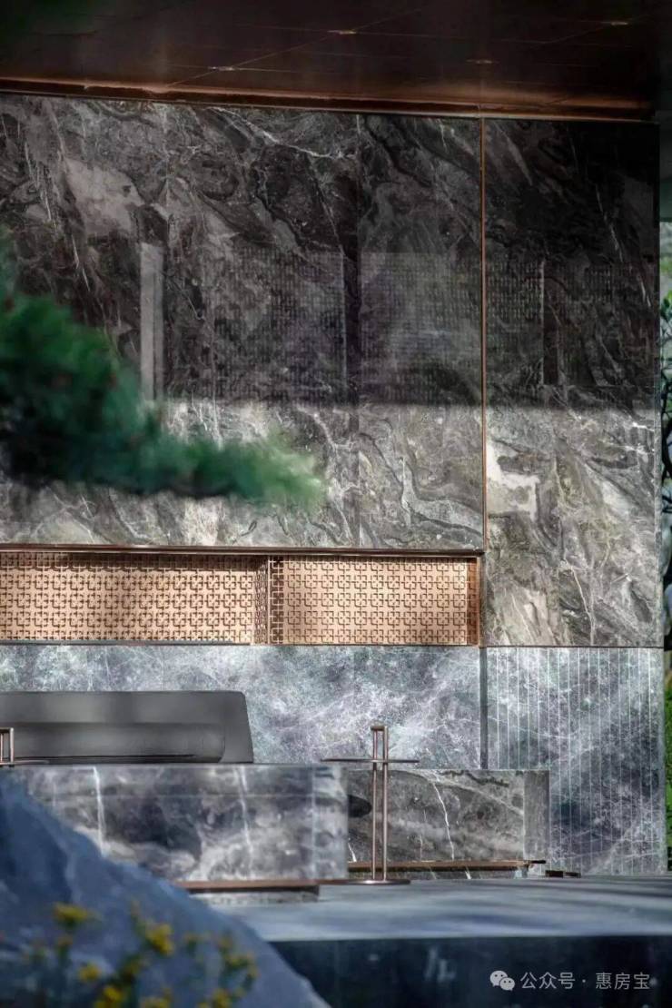 位于社区中央的第二景观会客厅聆星客厅,立面装饰有极具典藏价值的威尼斯棕奢石△、吊顶采用铝板切割镶嵌●、地面采用阿尔卑斯灰和福鼎黑拼花铺装。
