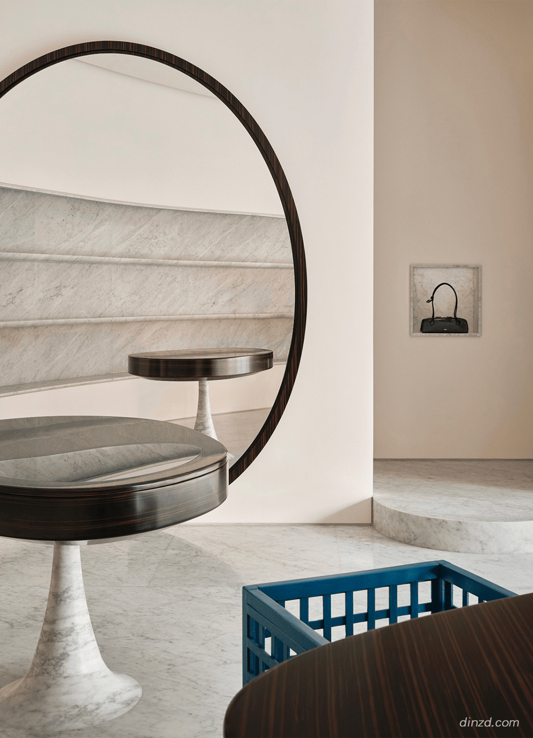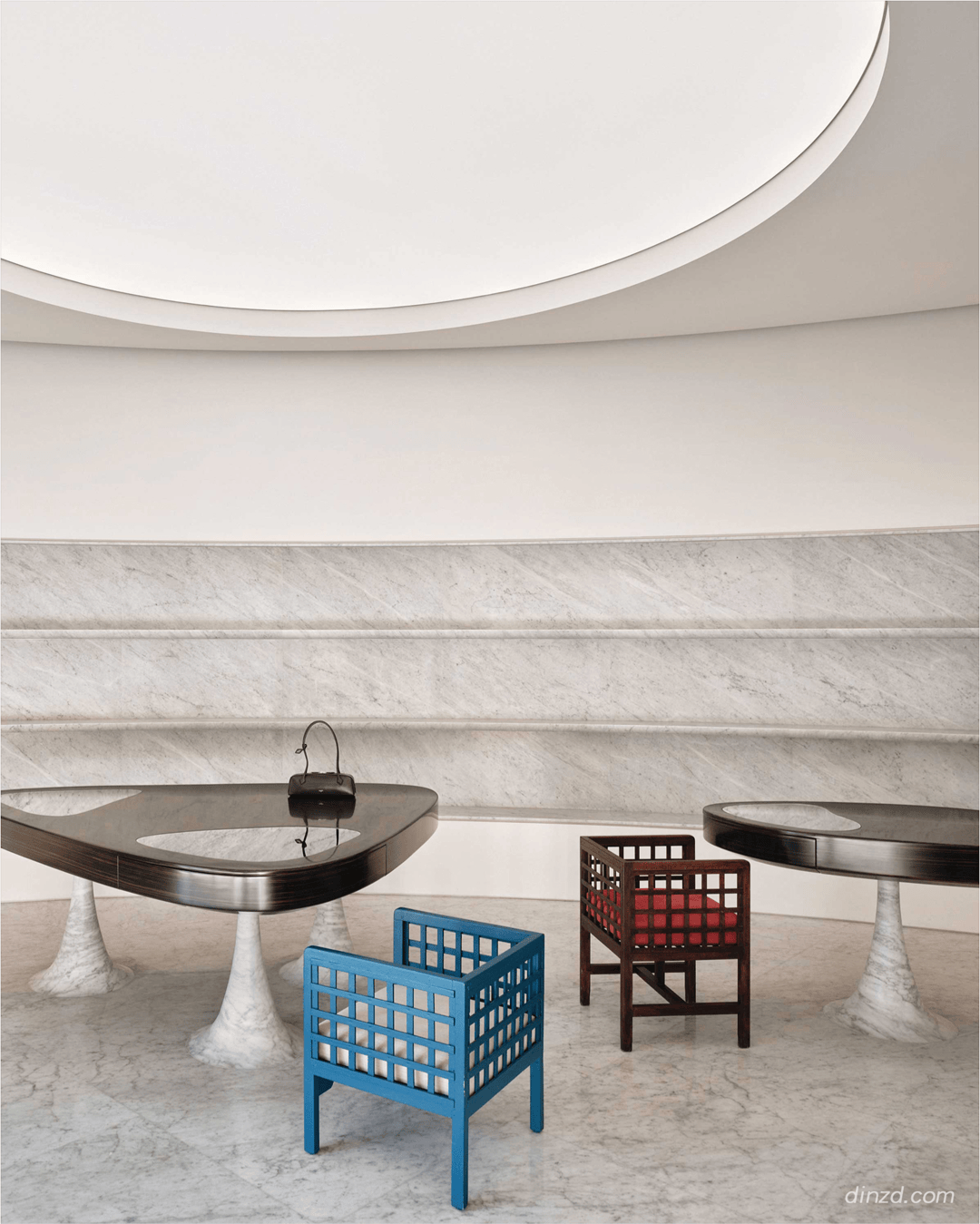 室内亦延续着同样的纯粹美学=◇◁。弧形有机线条与锐利几何结构形成鲜明对比,致敬Alaïa时装风格语汇☆▲●。大理石陈列架铺设于店铺一层空间,雕塑感展示台自地面升起,展现品牌皮具作品与其卓越工艺。时装巨匠PAUL POIRET设计的两把大型立方体彩绘木椅进一步烘托出空间中的温暖氛围,呼应着店内由曲线与几何形态交织而成的对话。