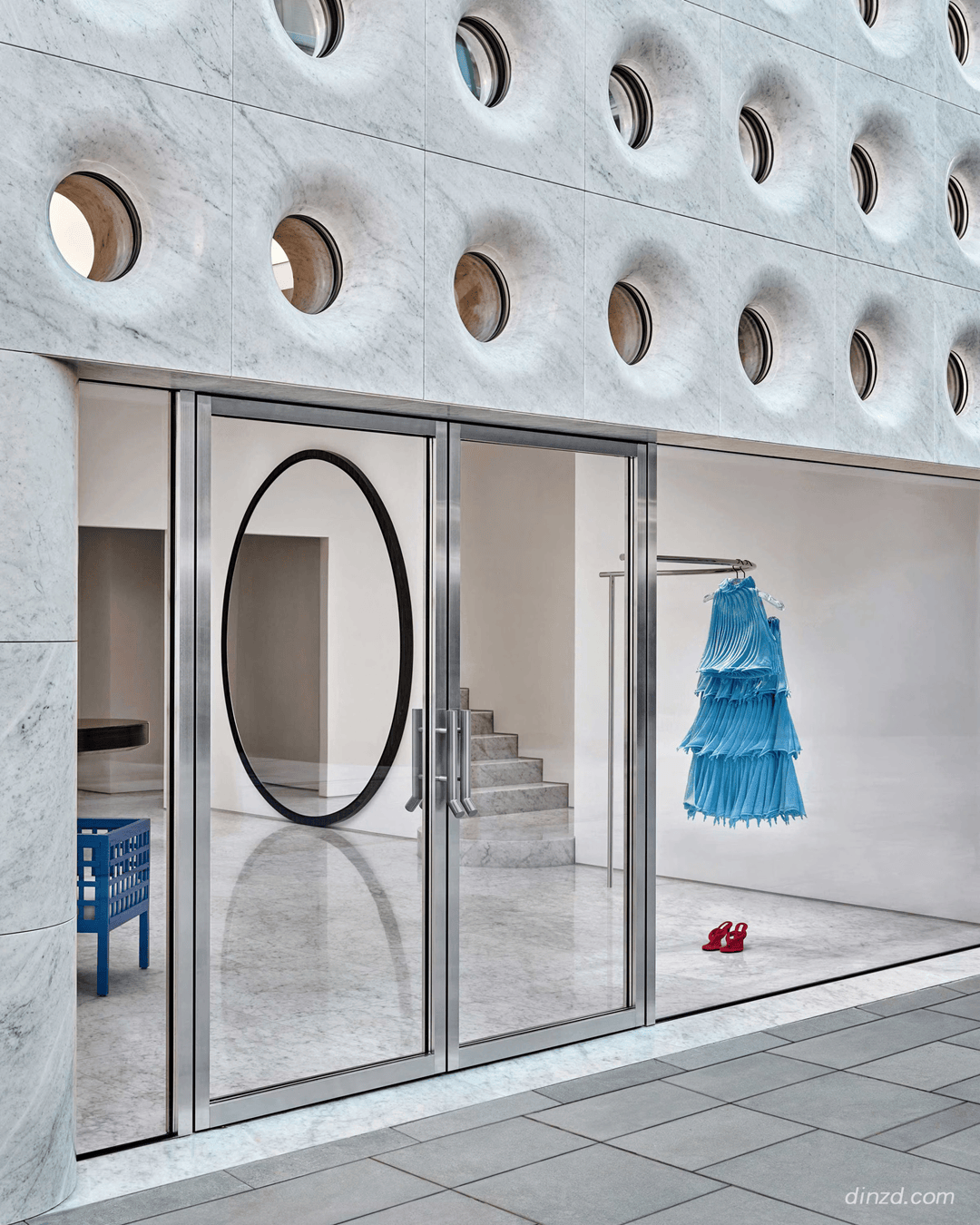 醒目的外立面采用坚固的卡拉拉大理石包裹,圆形与弧形窗口点缀其中,重释Alaïa标志性镂空图案◇。宏大而简约,带来品牌建筑语言的全新表达▼•▪。这一韵律化的开窗设计既减轻了石材的厚重感▲■◇,又营造出沉稳静谧的氛围▪▪=,在恢弘与内敛之间取得平衡,实现了高级定制精神与都市气息的融合…•。