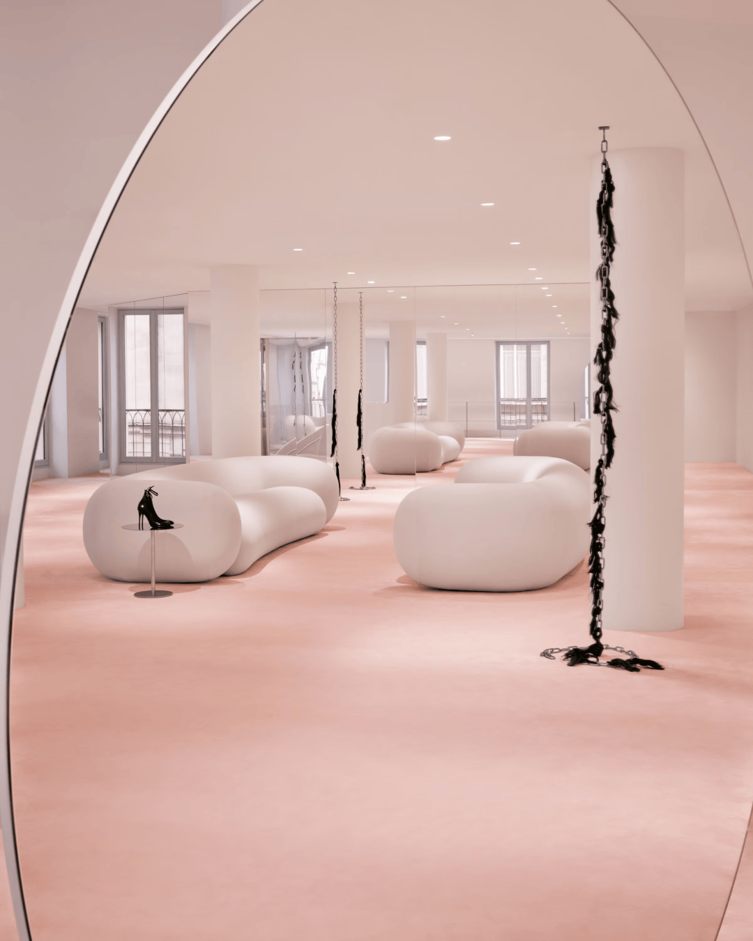 二层氛围更为宁静•,可于此探索Alaïa完整衣橱▲△★,包含成衣、标志性单品及全系列配饰。由Philippe Malouin设计的座椅框定出Halleroed打造的圆形立面窗景,窗外几何形态延续至室内,形成连贯的视觉韵律◆▷。整个空间充分体现对精湛工艺的追求——无论是石材处理△、家具设计◁,还是曲线与平面在空间中的对话,皆彰显出细腻的建筑表达与品牌美学的高度统一。